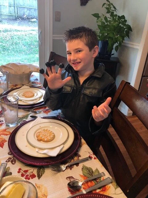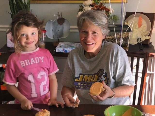 Rachel and “Gigi” frost the name card cookies for Thanksgiving dinner. Most of the frosting made it on to the cookies . . . 😊