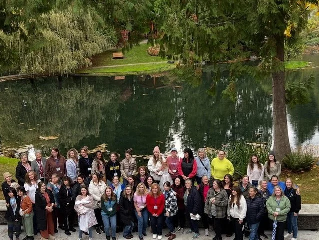 After overnighting with Stacey and her family in their rural forested home Thursday night, Oct 23, we drove to Cedar Springs Conference Center in Sumas, WA, for the Lake Country Baptist Church annual women’s retreat. The retreat center is nestled on a beautiful piece of property which boasts fastidiously maintained gardens through which one can wander on their asphalt pathways. Though rain fell throughout the weekend, protected by umbrellas, many walks were had.