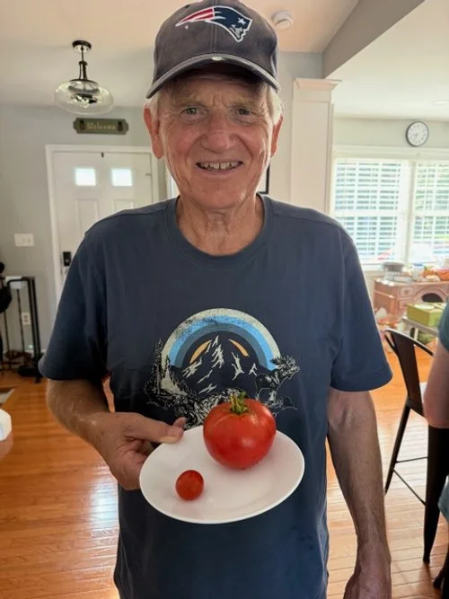 Summertime: pools, travels, slower pace, and fresh tomatoes from the garden. Paul is having great success with his tomato plants and was thrilled to harvest the first two this past week.