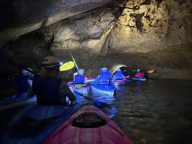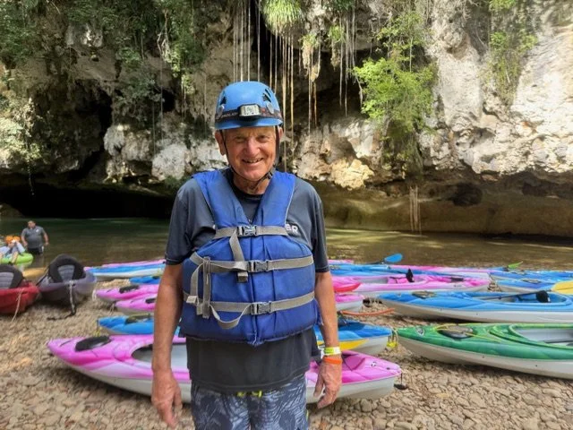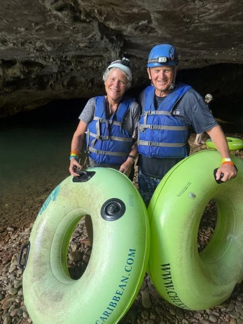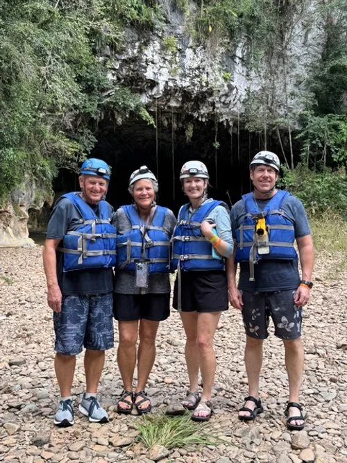 Decked out with life jackets and miner’s hats, we kayaked into very dark underground caves, seeing the wonders of stalagmites and stalactites, of quartz crystals everywhere, and many unique geological formations. After kayaking upstream and then back, we exchanged the kayaks for tubes—and roped together, our crew floated down the river through the rest of the caves. It was so unique, beautiful, even breathtaking. We loved it.