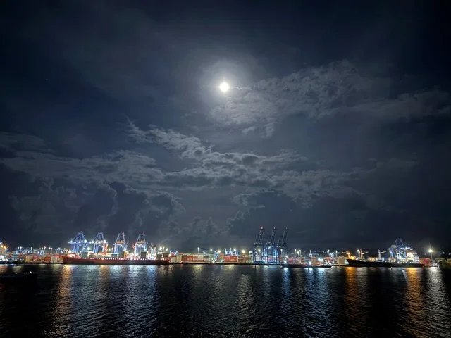 We went back through the locks the same day and ported at Colón for our next day’s adventure. We slept under a full moon, looking into the colorfully lit city of Colón.